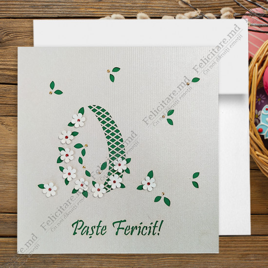 Felicitare personalizată dedicată sărbătorilor de Paşti. Confecţionată manual. La dorinţă hârtia exterioară şi interioară poate fi modificată. În interior se fixează foiţa cu text, pe care poate fi aplicat si logotipul companiei. La cererea clientului poate fi elaborat un model individual al felicitării.